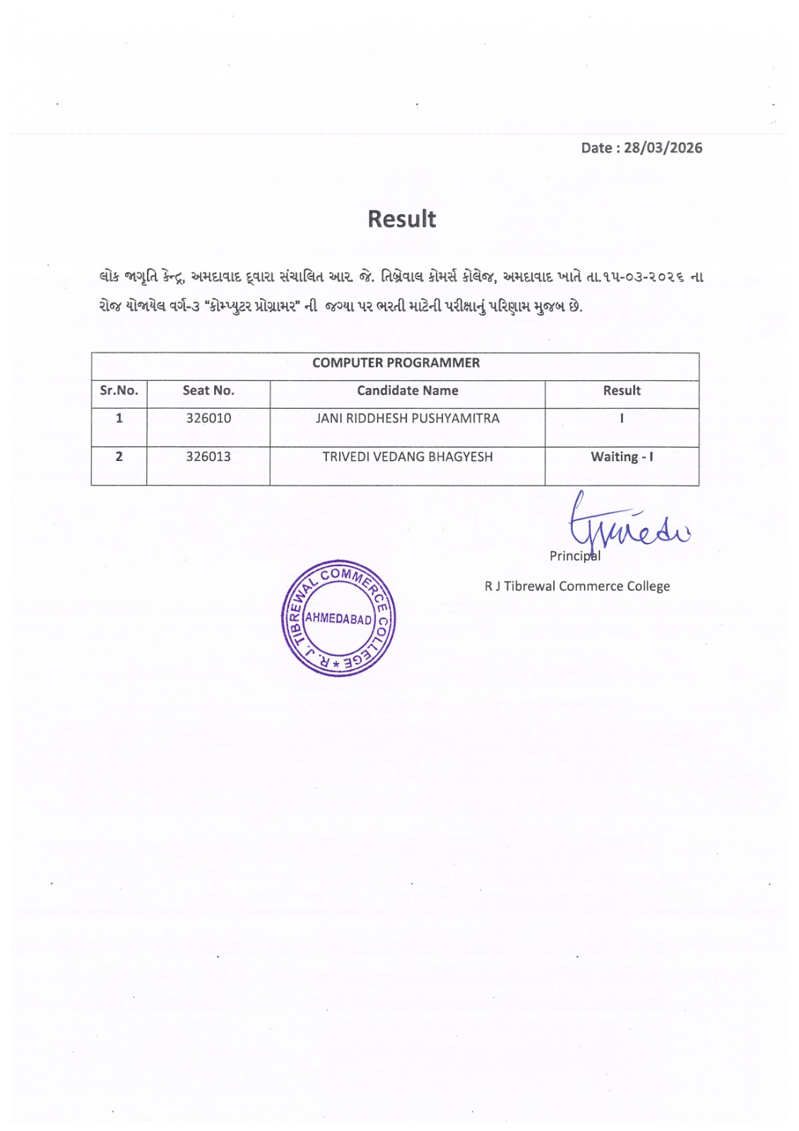 RESULT FOR THE POST OF COMPUTER PROGRAMMER